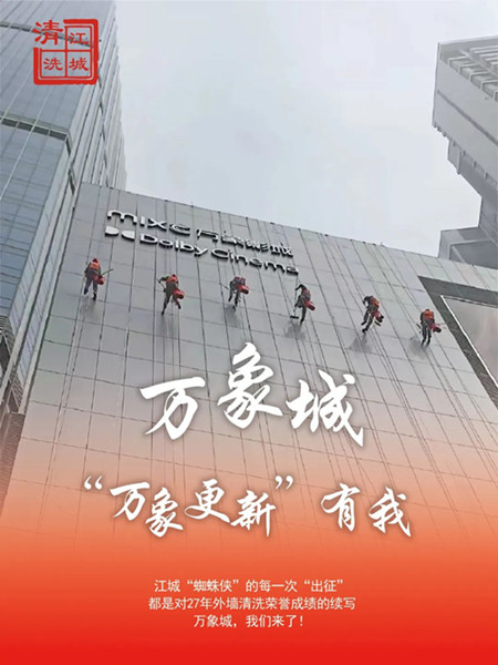 新的一年,萬(wàn)象城將以嶄新面貌迎客。江城清洗工程隊(duì)期望它能匯聚更多歡樂(lè)。若您也想讓地標(biāo)建筑外墻潔凈如新,江城清洗工程隊(duì)?wèi){借其專業(yè)、專注、耐心的外墻清潔工,定是您的.佳選擇,助您共筑城市美麗風(fēng)景線。